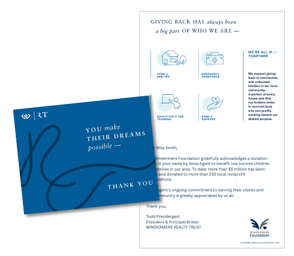 At Windermere Realty Trust, we believe we can make a greater impact on the community when we join together in our charitable efforts. That’s why every broker donates a portion of their commission from each transaction to the Windermere Foundation. Money generated by this standard donation and additional fundraising activities benefits local nonprofit organizations that support low-income families and children.